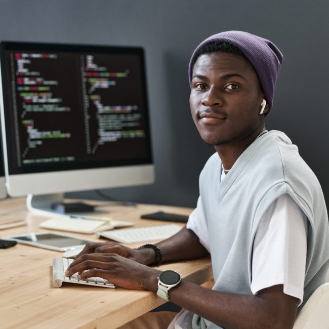 Young confident African American IT support manager looking at camera while sitting by workplace in front of computer monitors